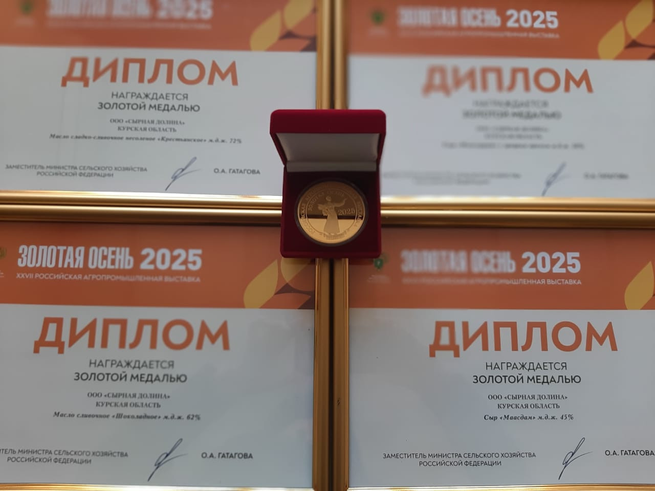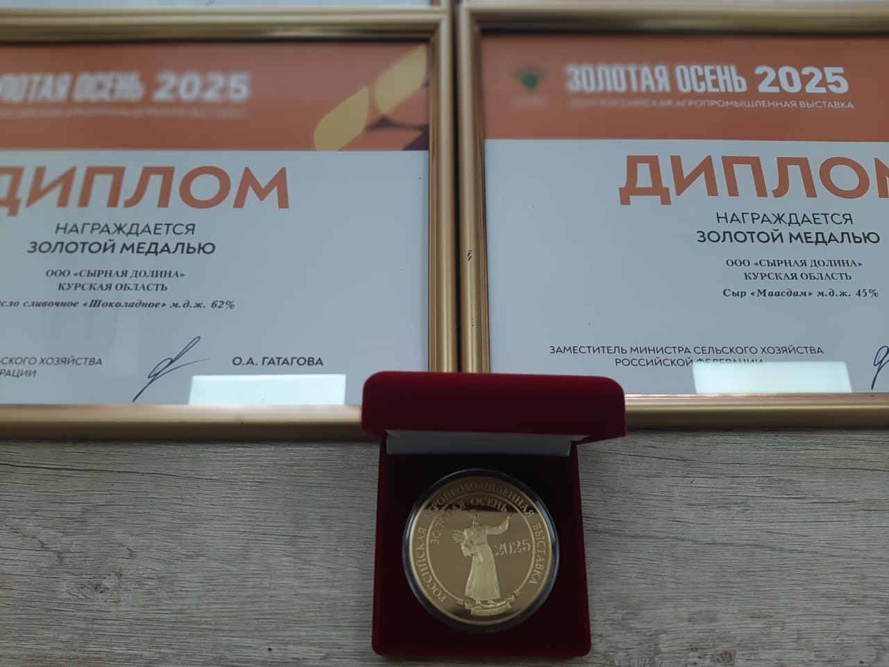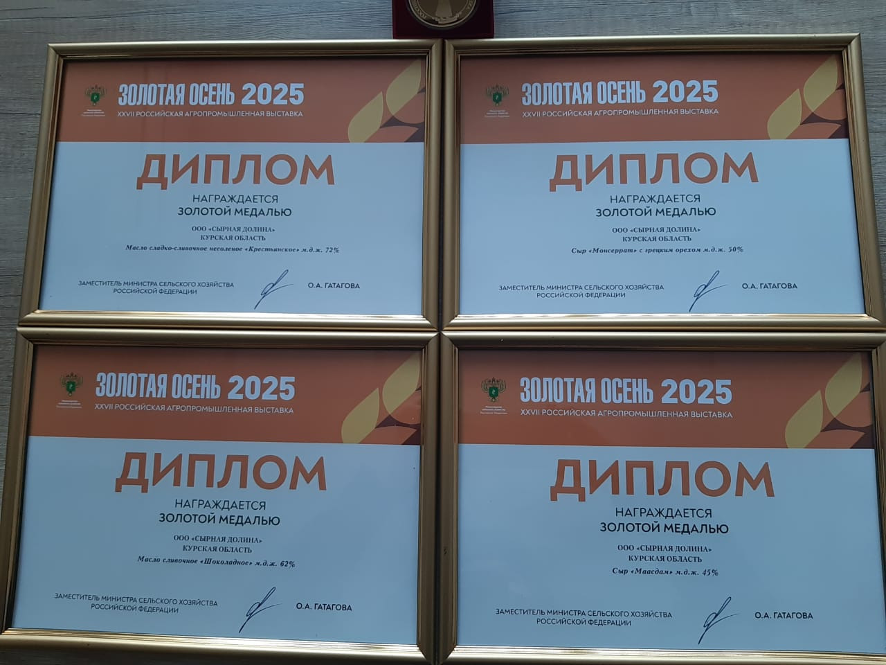 По итогам 27-ой Российской агропромышленной выставки «Золотая осень — 2025» ООО «Сырнаяя долина» отмечено четырьмя золотыми медалями и дипломами. Высшую оценку за качество получили масло сладко-сливочное несоленое «Крестьянское» м.д.ж. 72% и масло сливочное «Шоколадное» м.д.ж. 62%, сыр «Монсеррат» с грецким орехом м.д.ж. 50% и сыр «Маасдам» м.д.ж. 45%.